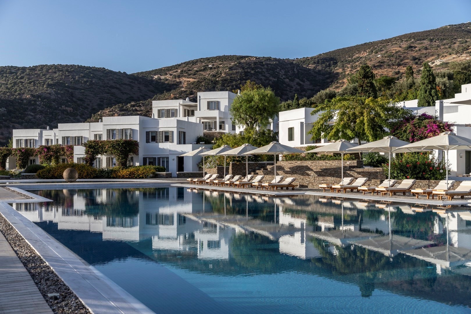 Built amphitheatrically, expanding from the edges of the Cycladic hills to the beautiful beach in the center of a picturesque and protected bay in Vathi of Sifnos, you will find Elies Resorts, an exclusive, luxury 5-star hotel of high aesthetics, enjoying the Aegean sun almost all day long, as well as the clear blue waters from a panoramic position.